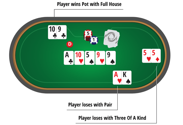 The flop in Texas Hold'em games usually defines how the hand progresses because it reveals three of the five community cards. This betting round starts with the player closest to the dealer's left; that player can check or bet. The next player can either fold, call the bet, or put in a raise.